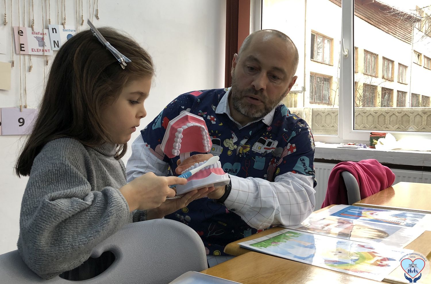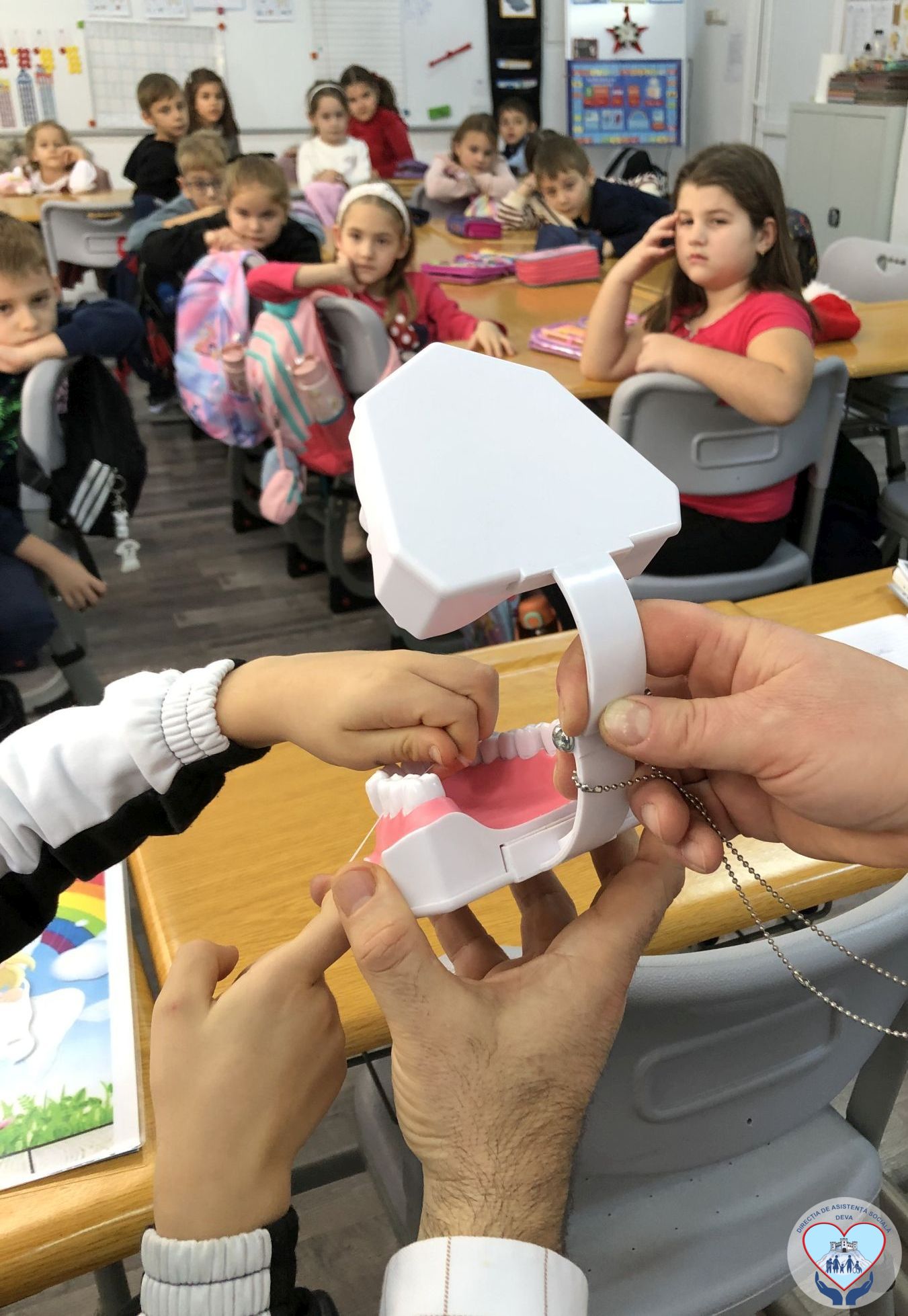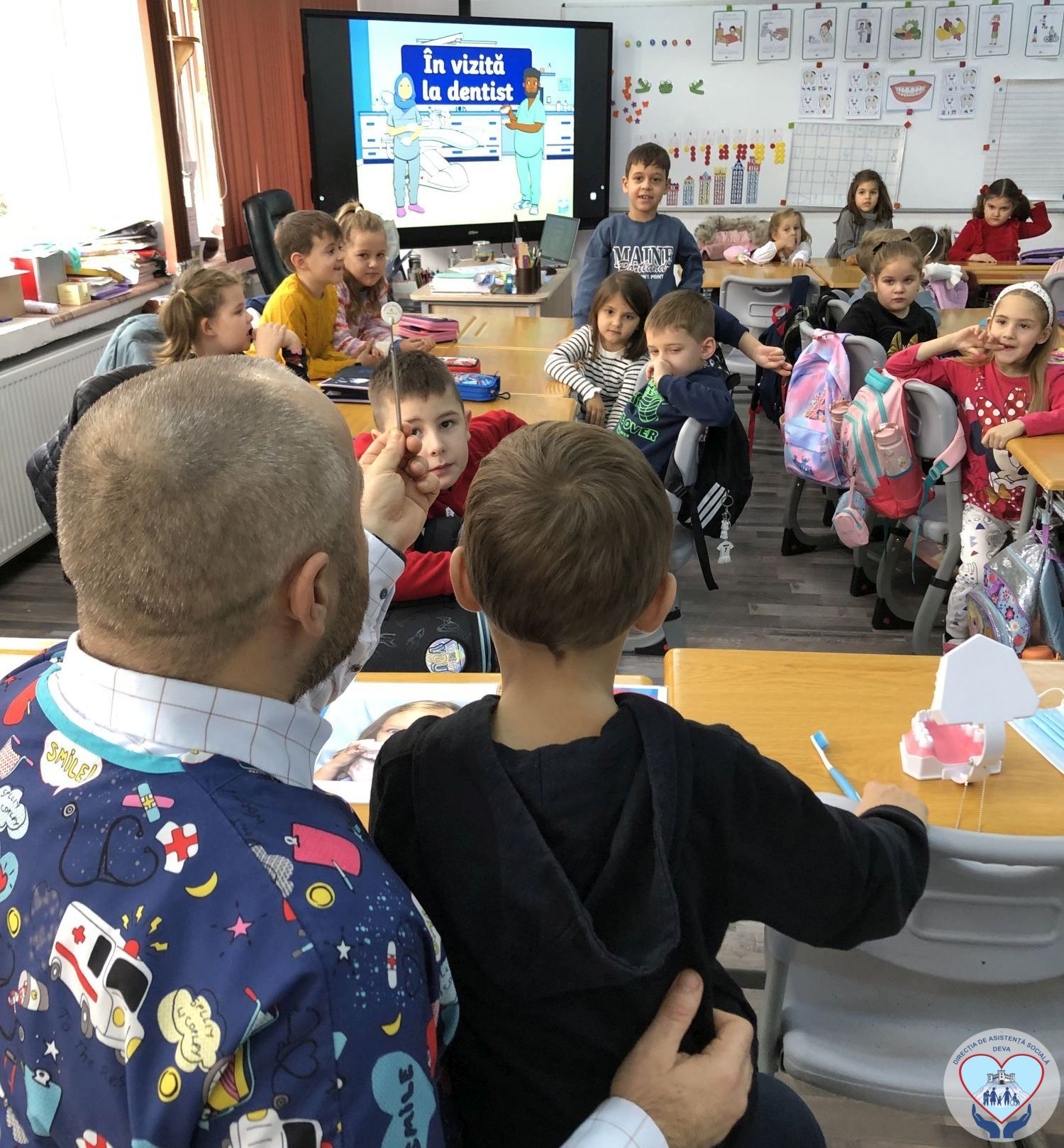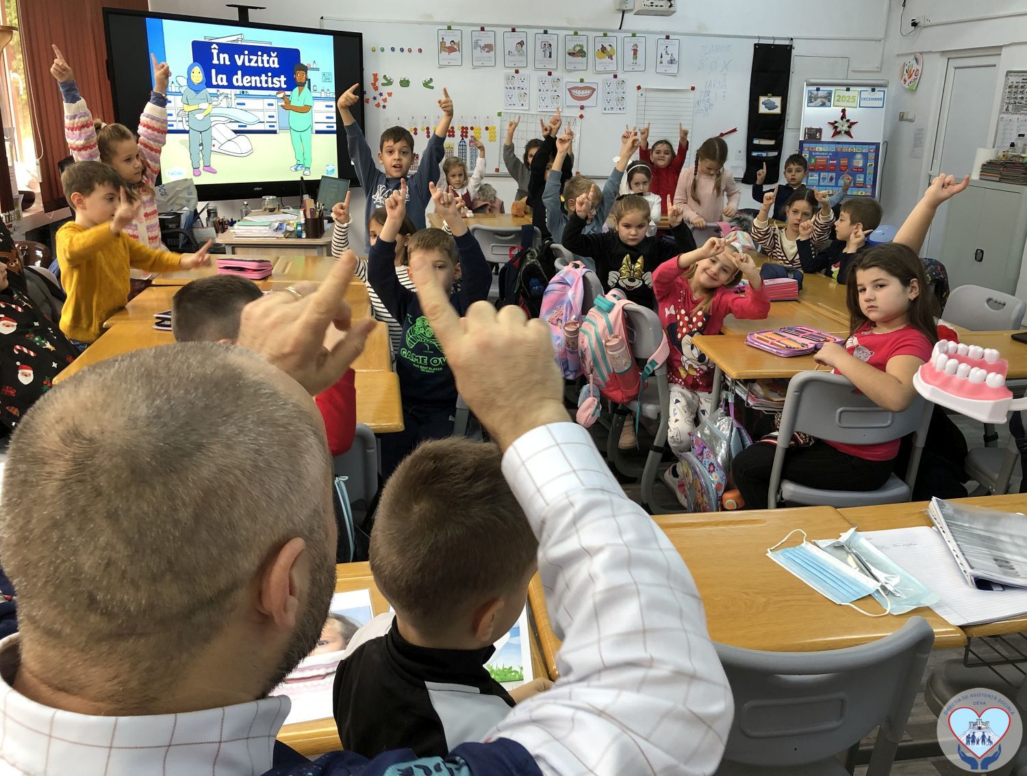 Lecția de educație dentară a făcut parte din seria activităților pe care cabinetele școlare de stomatologie le desfășoară în rândul preșcolarilor și elevilor cu vârste între 4 și 11 ani, cu scopul încurajării acestora de a face din spălatul dinților un obicei plăcut.