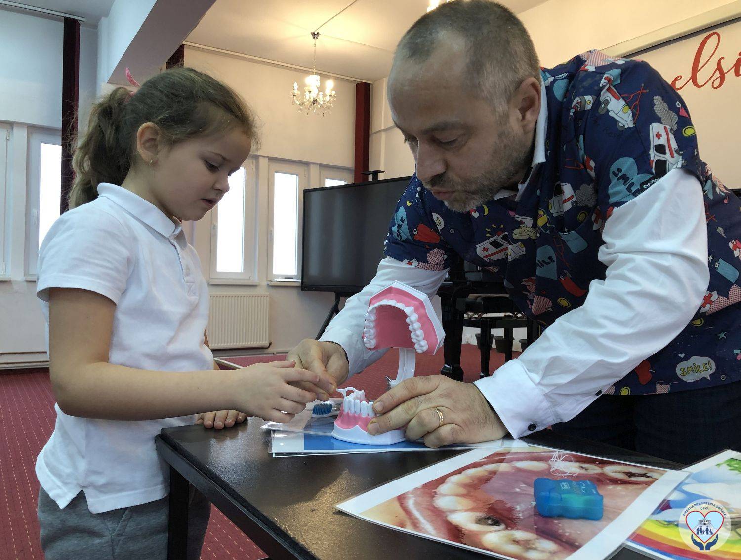 Spre încântarea elevilor, fiecare dintre ei a avut ocazia să se familiarizeze și să mânuiască instrumentele de bază folosite la o consultație stomatologică, iar cei mai curajoși au povestit cum și-au învins teama de dentist odată cu extracția primului dinte de lapte.