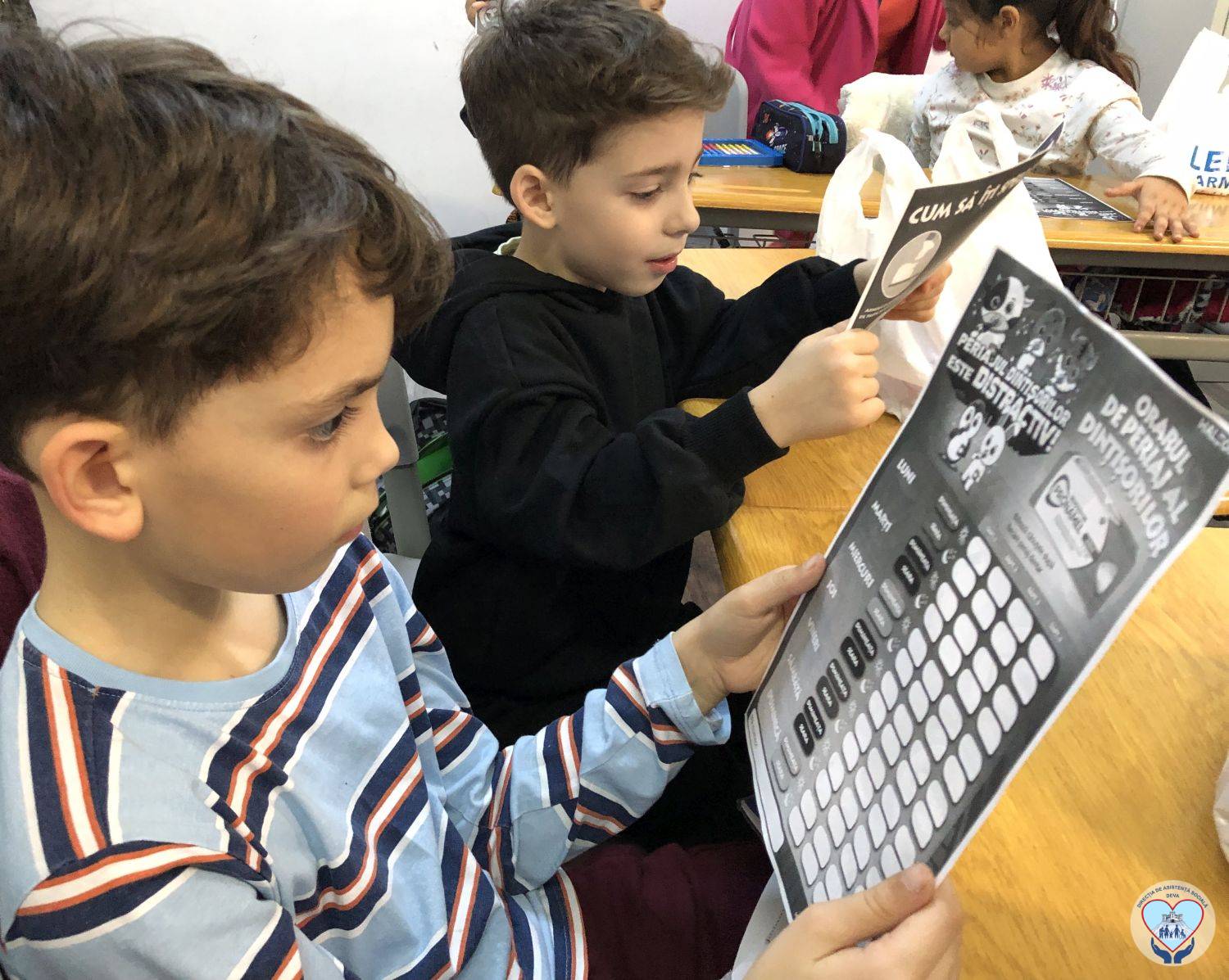 După ce, anul trecut, elevii au învățat principiile și beneficiile alimentației sănătoase, stomatologul școlii le-a explicat acum o serie de reguli ale igienei orale, care trebuie urmate chiar de la apariția primului dinte de lapte – pentru că îngrijirea preventivă joacă un rol important în menținerea sănătății dinților, iar cariile descoperite la timp sunt mai ușor de tratat.